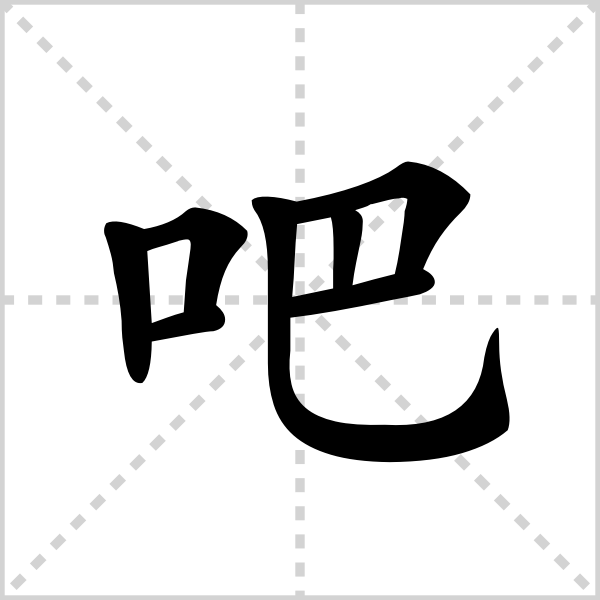 吧:bā,ba。从口、从巴。大蛇昂首而起所欲吞之形为巴之范式。口发出类似吞食的声音是吧之范式。